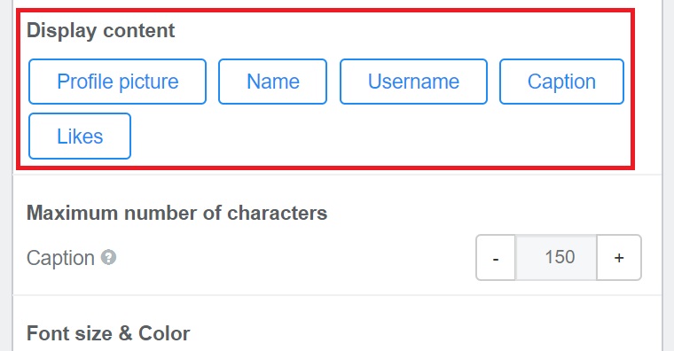 - Post– Contains Instagram-specific parameters that can be adjusted for pinpoint control over the appearance of widgets. Items include the Display content section, with switches for displaying profile pictures, names, captions, and likes, as well as max character limits and fonts.